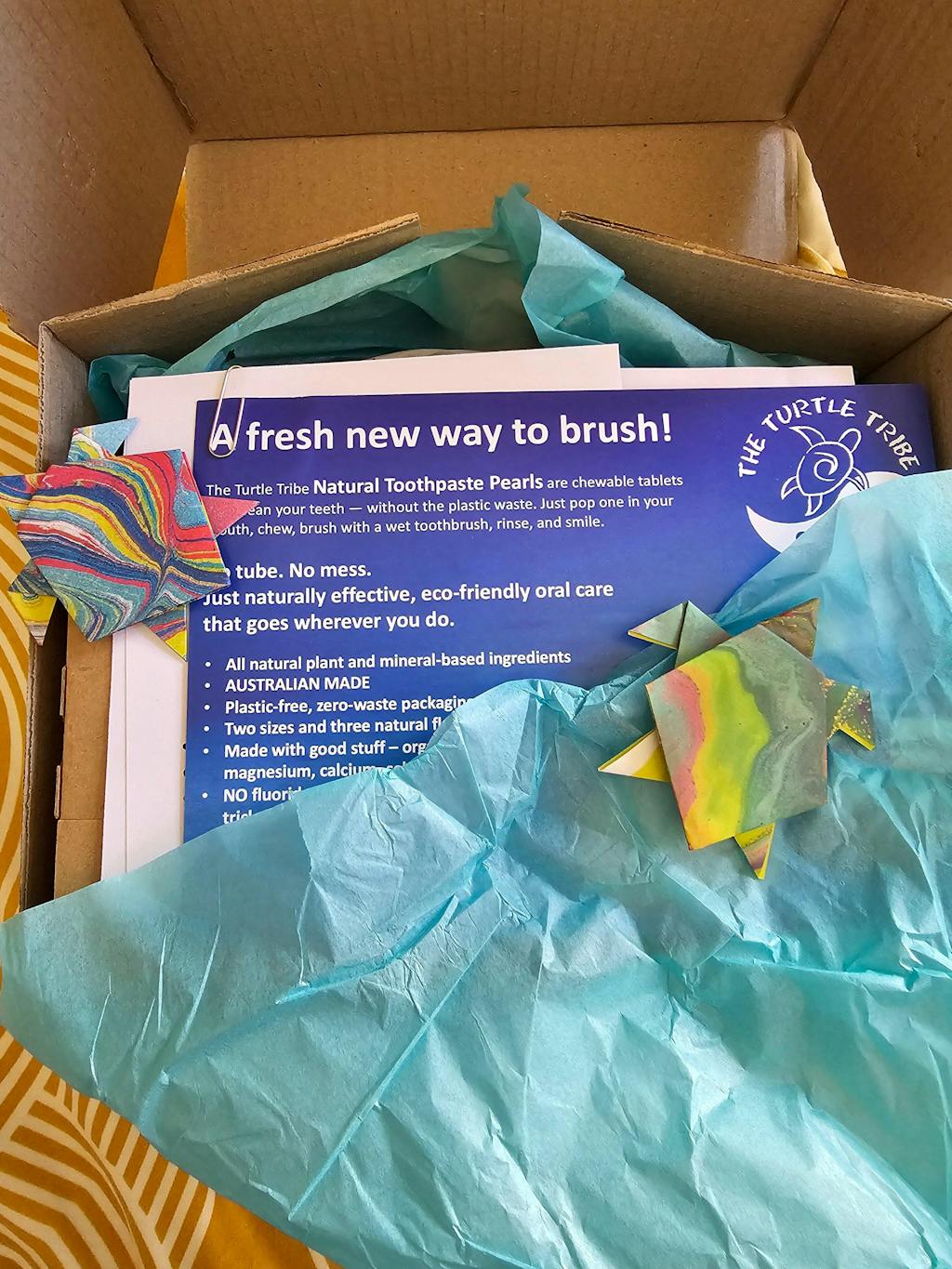 The Turtle Tribe ships orders in plastic-free shipping boxes and envelopes, with Kraft paper tape.