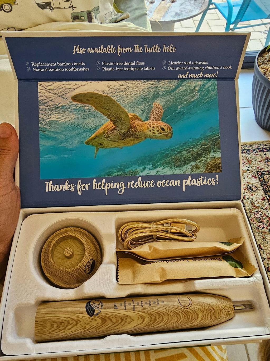 The Turtle Tribe Sonic Electric Toothbrush uses replaceable heads carved from bamboo. Each head takes around six months to decompose while a plastic one takes hundreds of years to break up into toxic micro and nano-plastics.